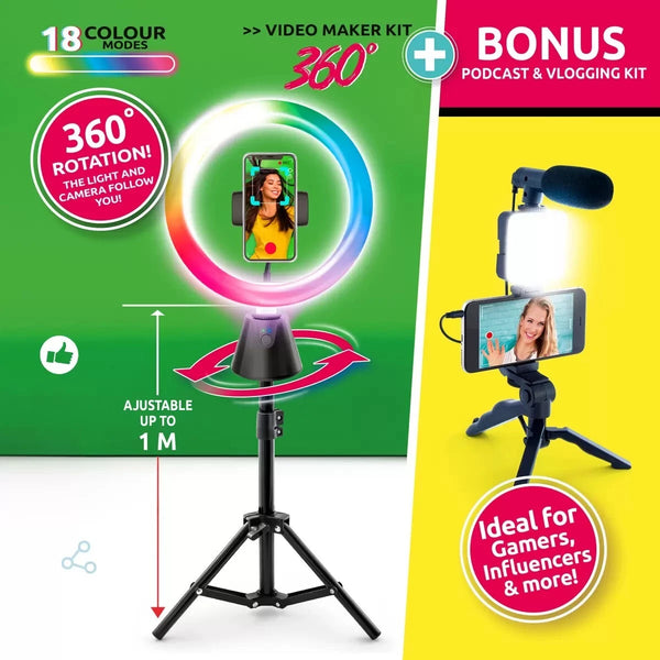 Capture content like never before with the 360 Video Maker Kit Combi Pack! Download the specially designed app to your smartphone and watch the 25cm LED ring light track your face as you move! Record videos to edit later or go live! Kit includes a green screen so you can add backgrounds of your choice. Plus, use the tripod for extra height & flexibility or use without as a desktop device. The perfect kit for any influencer, vlogger, budding actor, football freestyler and more! The extra Podcast & Vlogging kit included features a condenser microphone with audio cable, smartphone holder and an LED light with 3 levels of brightness. All of this can be attached to the handy tripod stand which can also be used as a grip for on-the-move recording! Create your own videos, podcasts, and vlogs like a pro wherever you are with this Combi Pack! Edit your content in your favourite apps and share with your friends, family or on your social media! It’s never been easier to create top quality content!