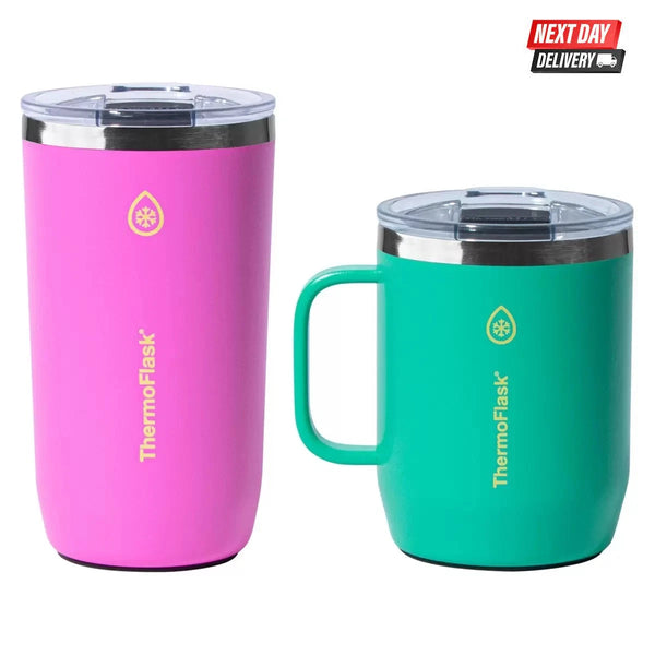 The ThermoFlask Stainless Steel insulated mug set is the perfect gift for coffee and tea lovers. This set includes a 450ml tumbler and a 340ml mug - great for home or on the go. Made from durable 18/8 stainless steel with double-wall vacuum insulation to keep drinks hot for up to 6 hours. Splash-proof slider lids and non-slip silicone bases add convenience and stability. Whether gifting or getting, it's a cozy essential for any day.